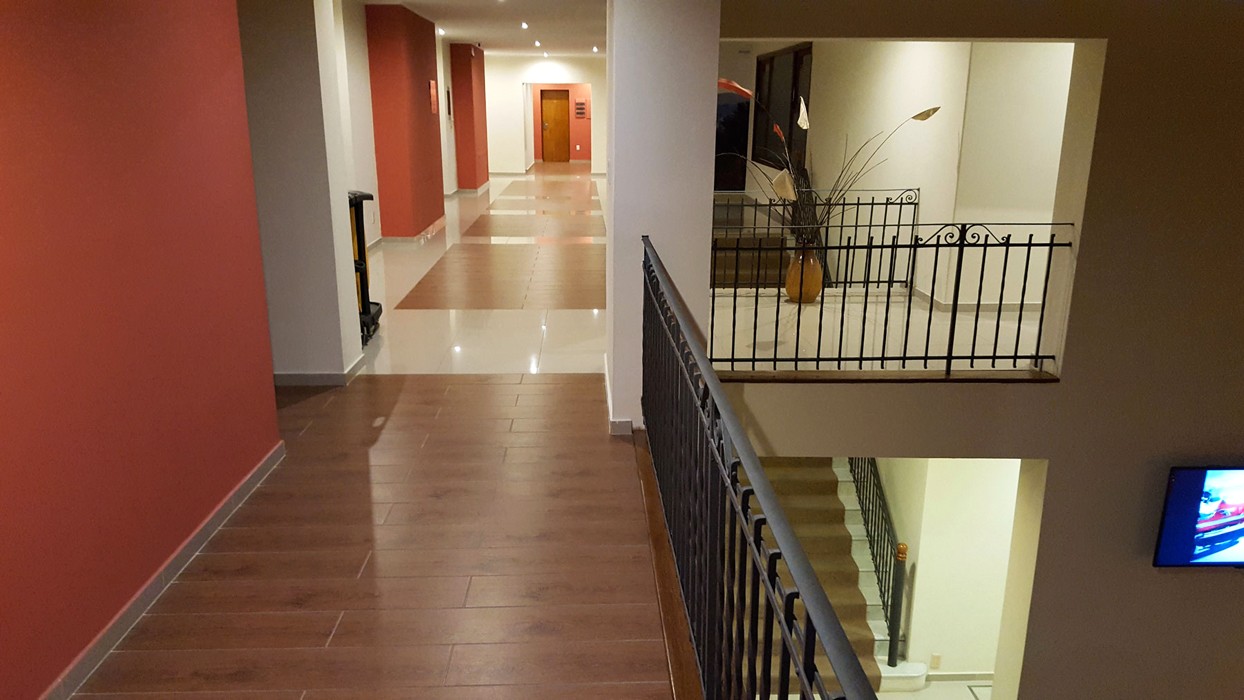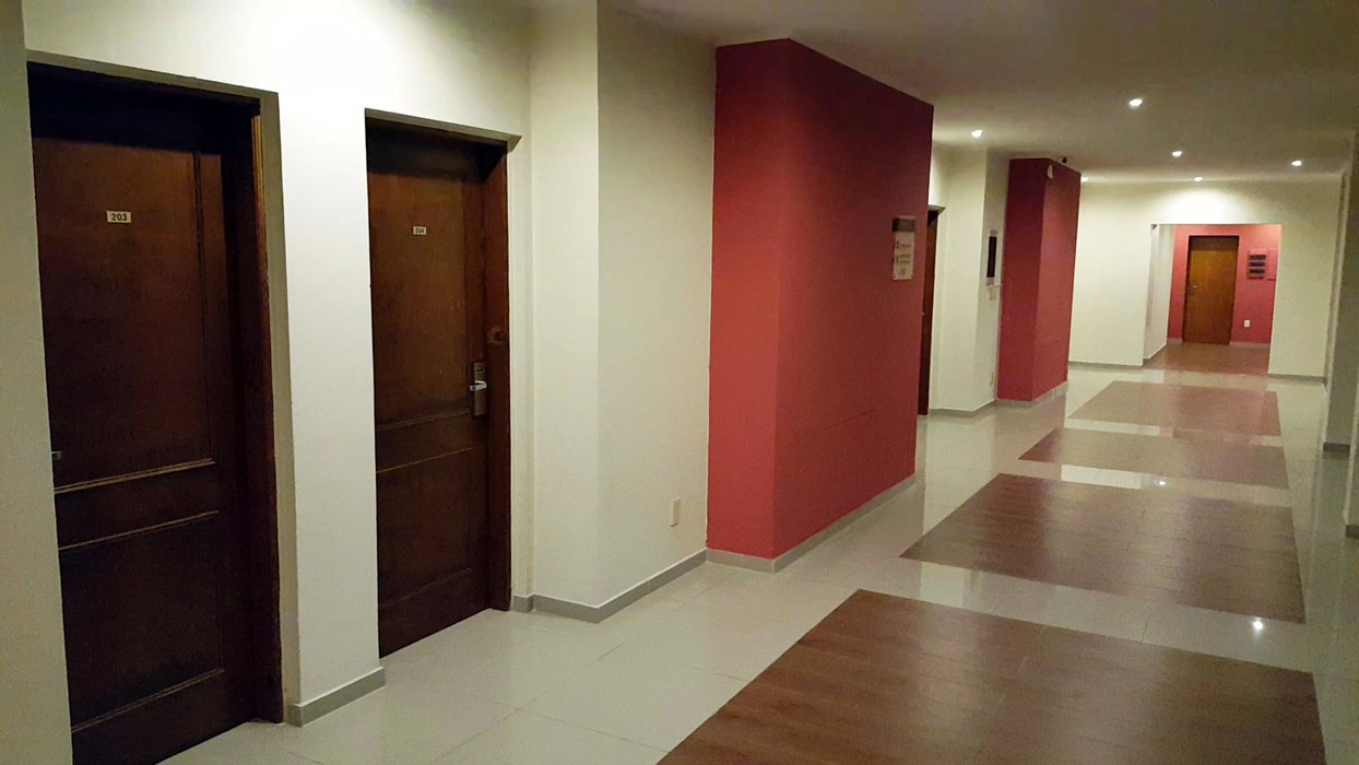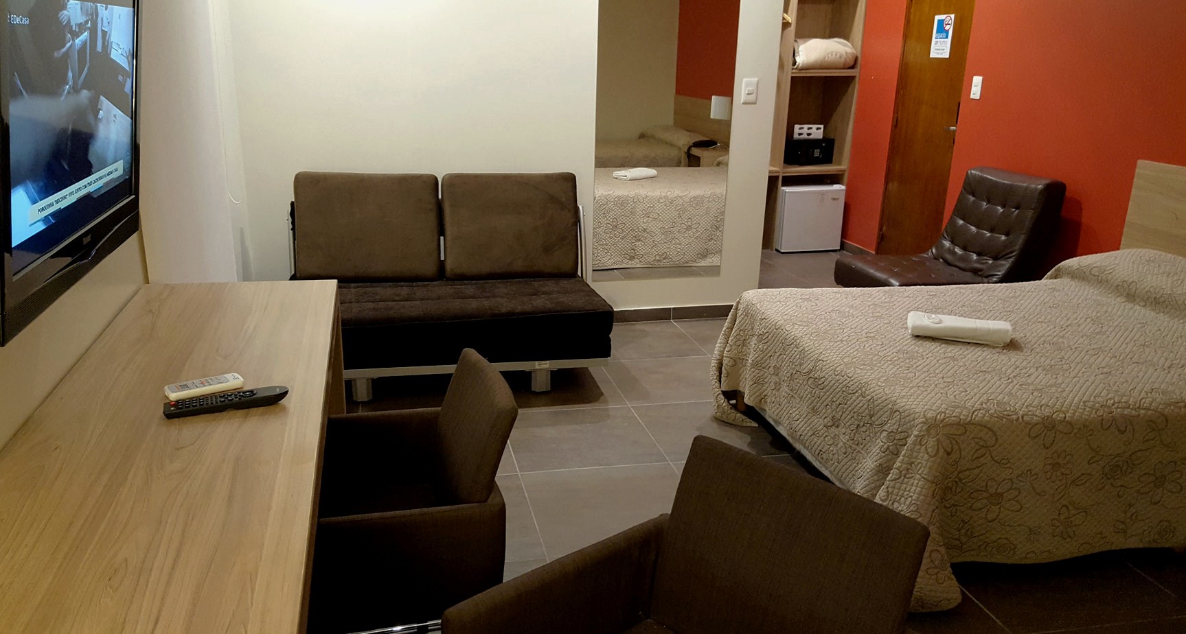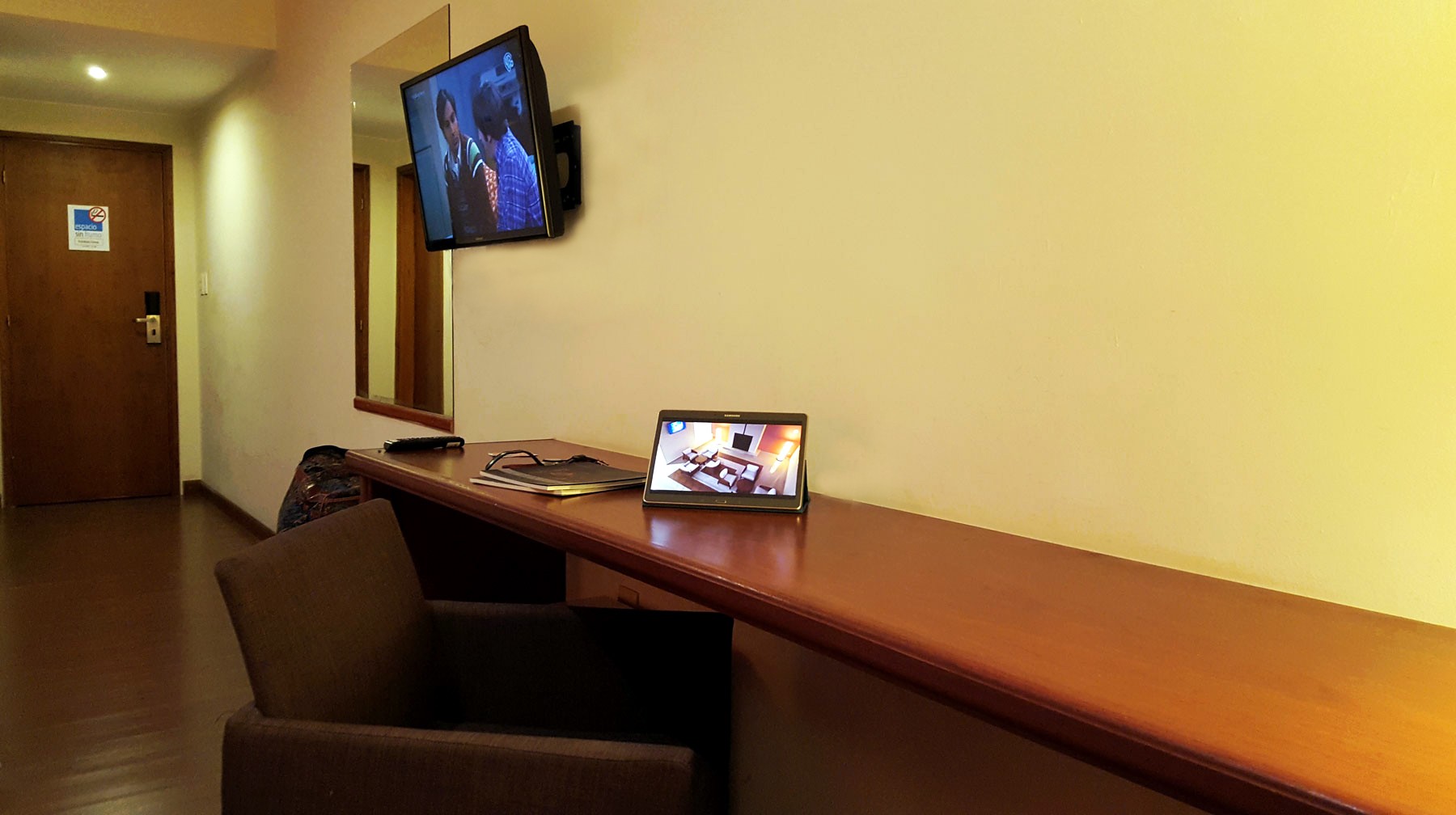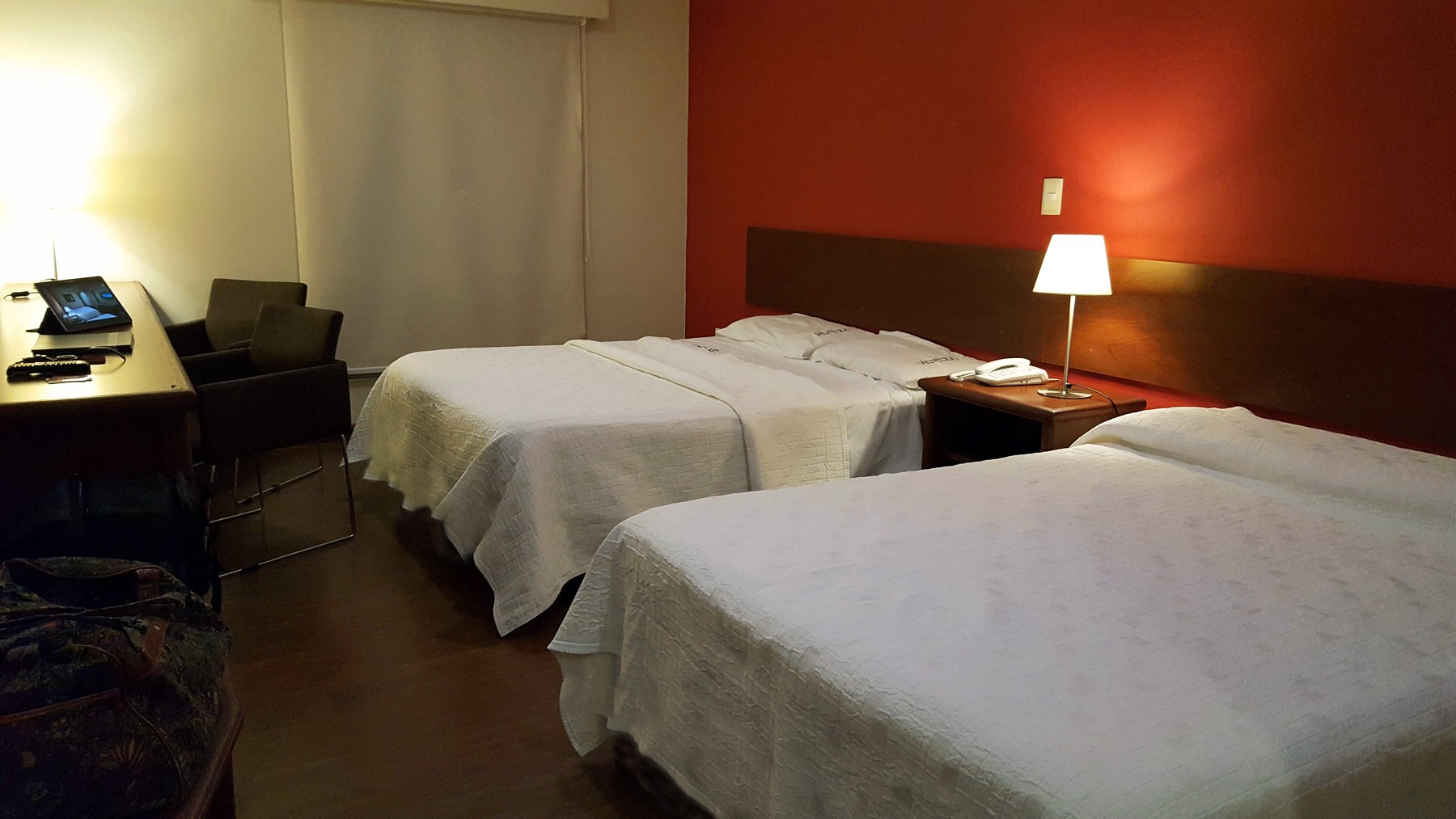 Los dormitorios son más que amplios, con espacio suficiente. Incluyen una larga mesada de madera para apoyar una computadora, tablet, celular y todo lo que uno lleva en el equipaje cuando viaja y debe tener a mano en forma visible, para utilizar durante la estadía. Continuando esta larga mesada hay otra más baja para apoyar bolsos o maletas. Junto a la puerta del baño y oculto a la visión del resto de la habitación un perchero, un estante para acomodar ropa, dejar zapatos y en el mismo, el cofre de seguridad. La televisión tiene buen tamaño, ofrece cable con varias señales, ubicada en la pared, frente a una amplia y cómoda cama con sommiers. Un buen espejo en una de sus paredes y, otro detalle interesante en estos tiempos donde la tecnología nos acompaña a todas partes, en la habitación hay varios toma corriente para conectar y cargar celulares o tablets.