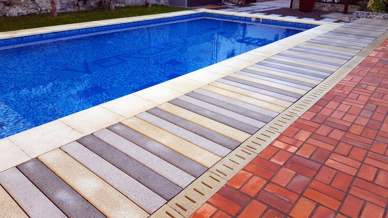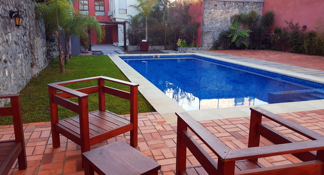 Cuenta además con un jardín con amplia piscina de material, cubierta con venecitas en tonos de azul, una cómoda escalera con escalones amplios y seguros, lo que facilita el ingreso de personas mayores y niños. La palabra Hotel Verdún en el fondo de la piscina invitan a un baño en la transparente agua minuana, o descansar en las reposeras o sillas y mesas de madera estilo Teka alrededor del jardín. Un detalle interesante es el piso que rodea la piscina, con distintos tipos de piedras antideslizantes en varios tonos. Estas piedras no se calientan con el sol y se pueden pisar sin problema.