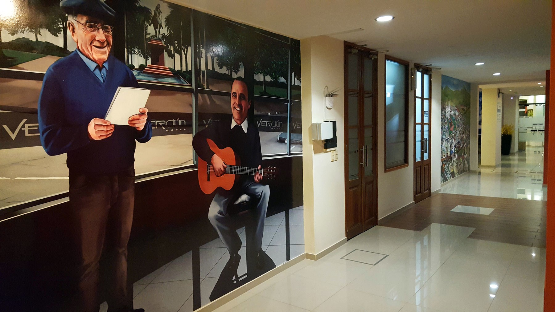 Recorriendo sus pasillos nos encontramos con varias gigantografías, sobre el Cerro del Verdún, otra de los minuanos Santos Insaurralde y Santiago Chalar, poeta y cantante minuanos con varios long play - discos editados en Uruguay. Desde sus poemas y canciones han reflejado la vida y el paisaje del Departamento; podríamos dejarnos llevar por el tema Minas y abril para recorrer los distintos sectores del Hotel Verdún y su ciudad. Otros murales forman parte del lugar, donde el pasajero se siente a gusto en un espacio donde el arte y el diseño fueron cuidadosamente pensados y estudiados para seducir a quienes se hospedan y a quienes aprecian lo confortable, lo realmente agradable.