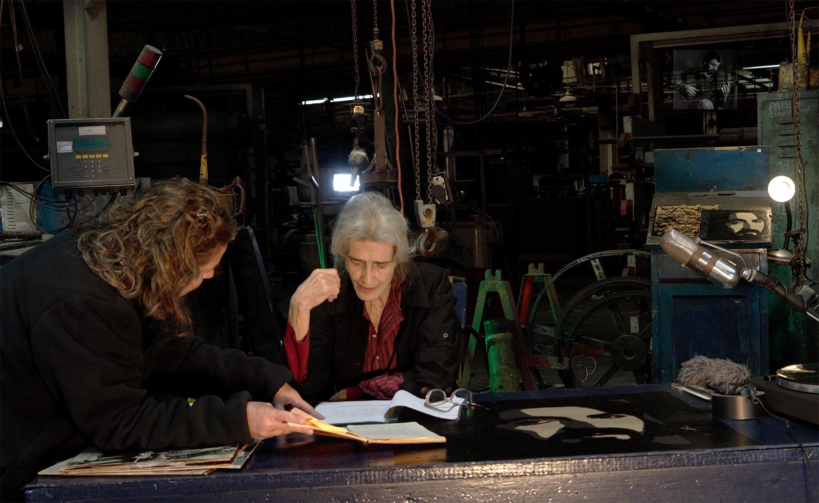 Vera Sienra, momentos antes del rodaje, repasando uno de los textos de la obra de Manuel Capella. Rodaje realizado en la fábrica FUNSA, en el barrio Villa Española, Montevideo.