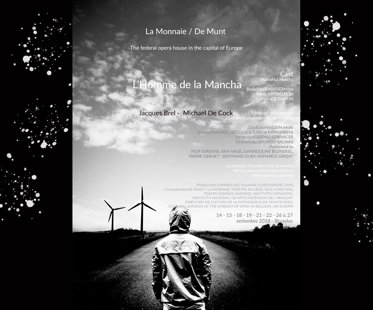 En 1968, el cantante belga Jacques Brel también interpretó el papel principal de Don Quijote de la Mancha, el personaje de la historia de Miguel de Cervantes. La Orquesta de Cámara y la Kooracademie van de Munt participará en la nueva versión que se exhibirá en el KVS de Bruselas en setiembre. La producción está en manos del director de KVS, Michael De Cock. Filip Jordens asumirá el doble papel de Cervantes / Don Quijote. Este actor y cantante previamente realizó una gira internacional en homenaje a Brel.