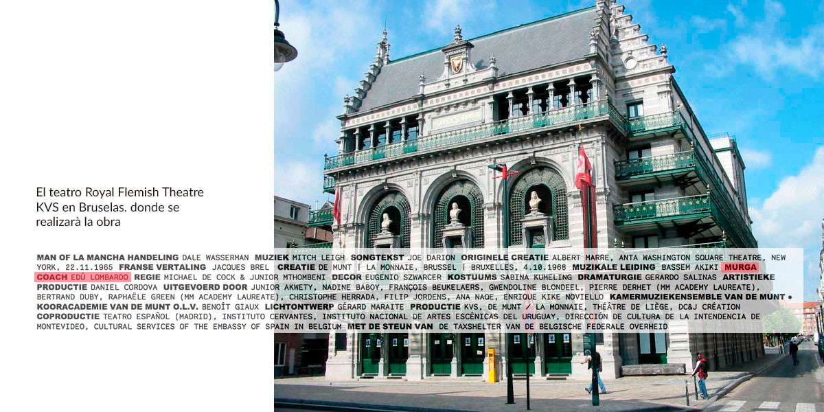 Hace cincuenta años, el 4 de octubre de 1968, el musical estadounidense Man of La Mancha se estrenó en The Munt, traducido al francés por Jacques Brel. El cantante belga murió diez años después, el 9 de octubre de 1978. El KVS y la Casa de la Moneda realiza una nueva producción del Hombre de la Mancha, como tributo a Brel y quizás también un símbolo del momento en que Bruselas se sacudió bruscamente, pero con la mirada fija en la ciudad de hoy y de mañana. Michael De Cock, director artístico de KVS, dirige este musical, en el que Cervantes, con el manuscrito de su novela Don Quijote bajo el brazo, termina en una prisión de la Inquisición y realiza la historia para sus compañeros de prisión. Eduardo Pitufo Lombardo participará de esta serie de espectáculos que se realizarán en el teatro La Moneda de Bruselas, Bélgica. El músico y compositor uruguayo trabajará incorporando ritmos de murga en la obra El Hombre de la Mancha, que se encontrará incorporada en la temporada lírica del citado teatro de ópera, uno de los más prestigiosos del mundo. Es la primera vez que el ritmo de murga uruguaya formará parte de una partitura lírica, en un centro internacional de música. Esta posibilidad surge de un acuerdo realizado por el Instituto Nacional de Artes Escénicas MEC, la Dirección de Cultura de la Intendencia de Montevideo y las autoridades de la casa de teatro belga. Lombardo estará viajando en distintos momentos del año para la realización y presentación de dicho espectáculo.